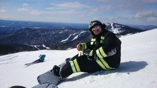 Сильно сложно в боевой одежде пожарного стоять на сноуборде или на лыжах? Ничего сложного, обычная одежда, как у сноубордистов, грубо говоря. Конечно, в этой одежде еще специальный подклад имеется, но на сам спуск он просто отстёгивается, а то жарко очень. Если к вам в компанию попросятся коллеги из других регионов, возьмёте в команду? Конечно. В первый раз, когда мы это организовывали, в Шерегеше ребята из Омска отдыхали. Увидели нас, подъехали. Говорят, ничего себе вы даёте! Знали бы, с собой боёвки захватили.