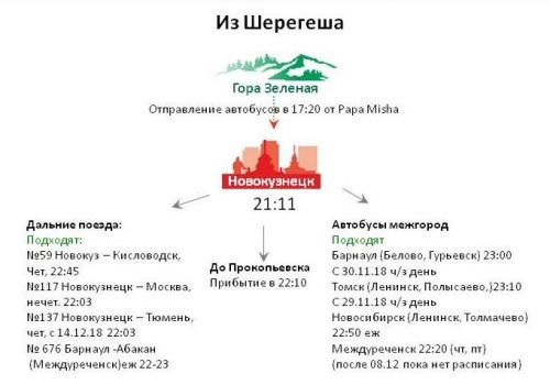 Отправление из Шерегеша: 17:00 (поселок), 17:20 (бар "Папа Миша" на горе) Отправление из Чугунаша: 18:00 Прибытие в Новокузнецк: 21:11