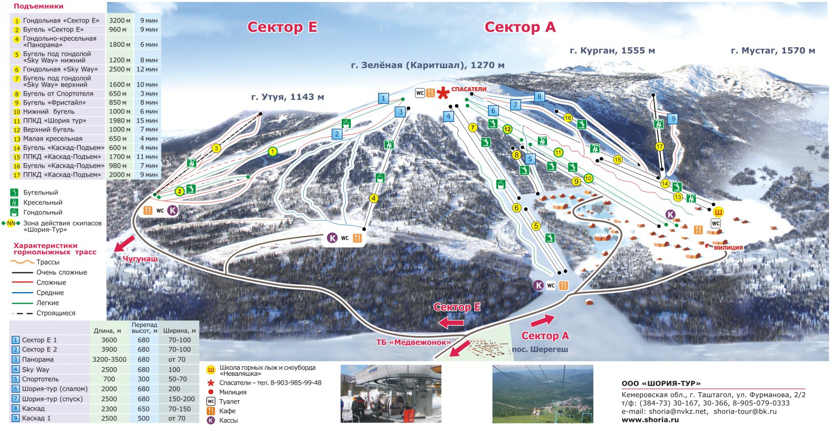 Схема горнолыжного комплекса на горе Зеленой компании "Шория-тур". На схеме даны характеристики трасс и канатных дорог горнолыжного комплекса и местоположение экстренных служб. |