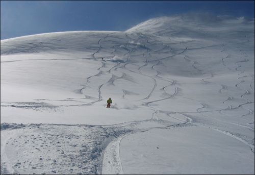 В Шерегеше уникальный снег. Определенное сочетание влажности, высоты и температуры создает особый мягкий "пухляк". Кроме отратраченных трасс, в Шерегеше много "пухлячных" полей, как в шаговой доступности, так и удаленных от цивилизации.