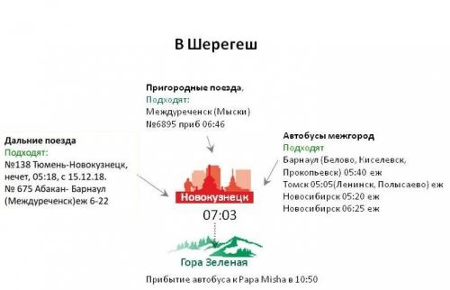 Отправление из Шерегеша: 17:00 (поселок), 17:20 (бар "Папа Миша" на горе) Отправление из Чугунаша: 18:00 Прибытие в Новокузнецк: 21:11